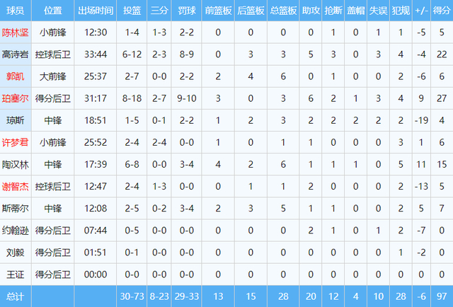 末节决战,山东队依然打得非常顽强。陶汉林扣篮得手,珀塞尔突破上篮命中,山东队将比分追成87平。本节过半,陶汉林抢篮板犯规,五犯离场。接下来,郭凯、珀塞尔连续进攻不中,塔克反击上篮得手,打停山东。暂停后,高诗岩命中关键三分球。决胜时刻,琼斯意外上场,山东队接连出现3次失误,比赛逐渐失去悬念。最终,山东队97-103输掉比赛。